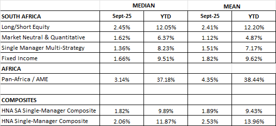 The broader HedgeNews Africa South Africa Single Manager Composite, which includes all SA hedge fund strategies, added 1.82% for the month, bringing the median return to 9.89% for the first three-quarters of the year.